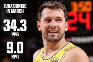 东契奇三月场均砍下34.3分9.0篮板7.7助攻,带领球队取得8胜1负的战绩。