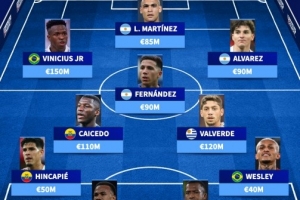 前锋:维尼修斯(巴西、皇马、1.5亿欧)、劳塔罗(阿根廷、国米、8500万欧)、阿尔瓦雷斯(阿根廷、马竞、9000万欧)