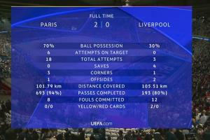 没悬念!巴黎vs利物浦全场数据:红军0射正!巴黎18射6正攻势如潮